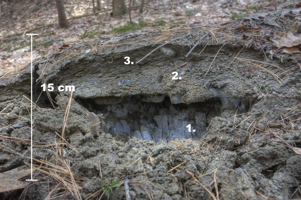 1. Needle ice, which has extruded up from the freezing front through porous soil from a water table below 2. Coalesced ice-rich soil, which has been subject to freeze-thaw 3. Thawed soil on top.