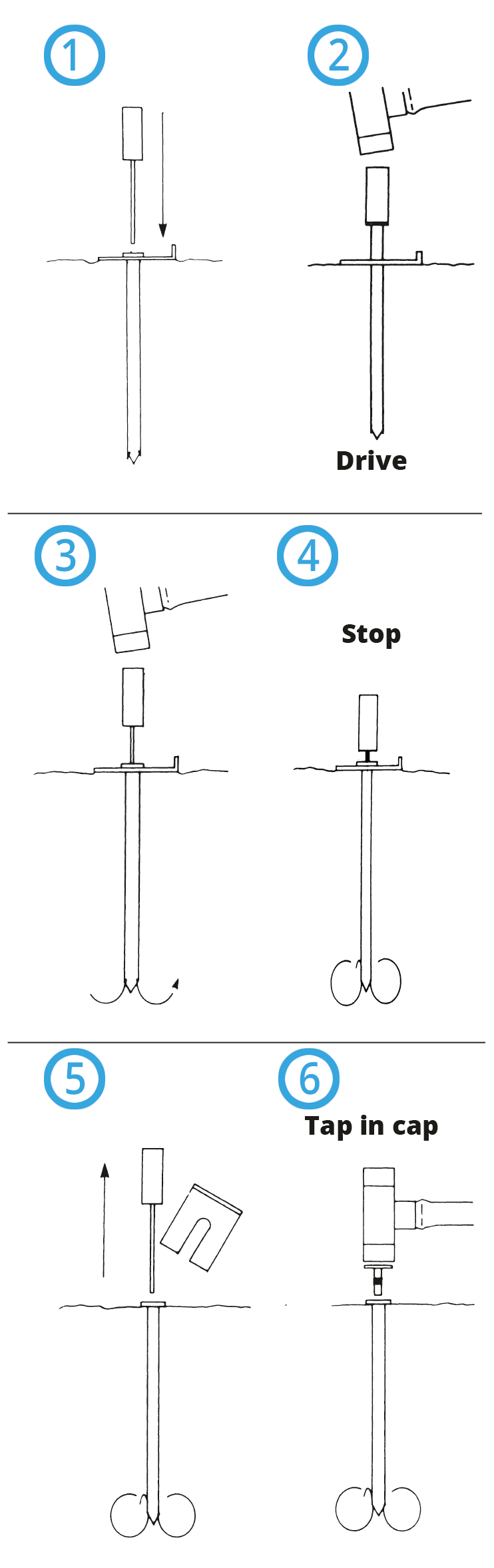 Drive: The hollow spike is driven into the ground like a standard stake.